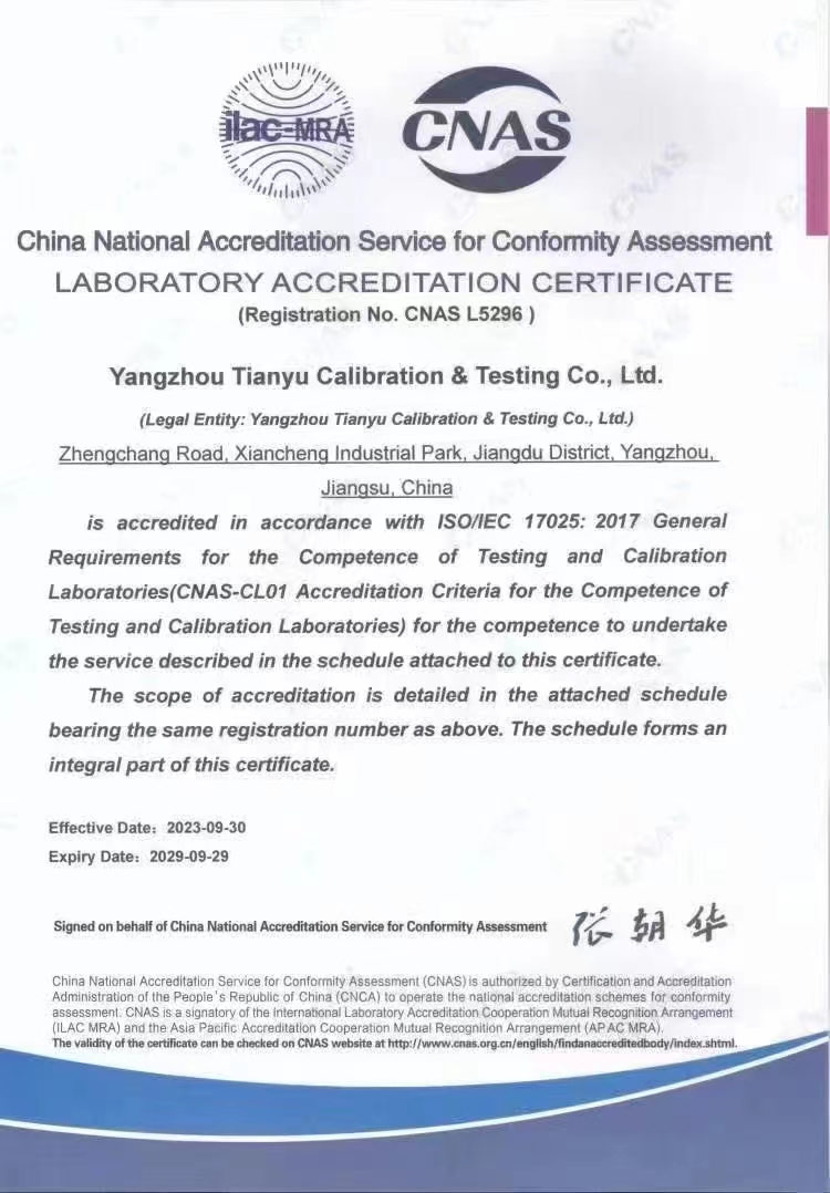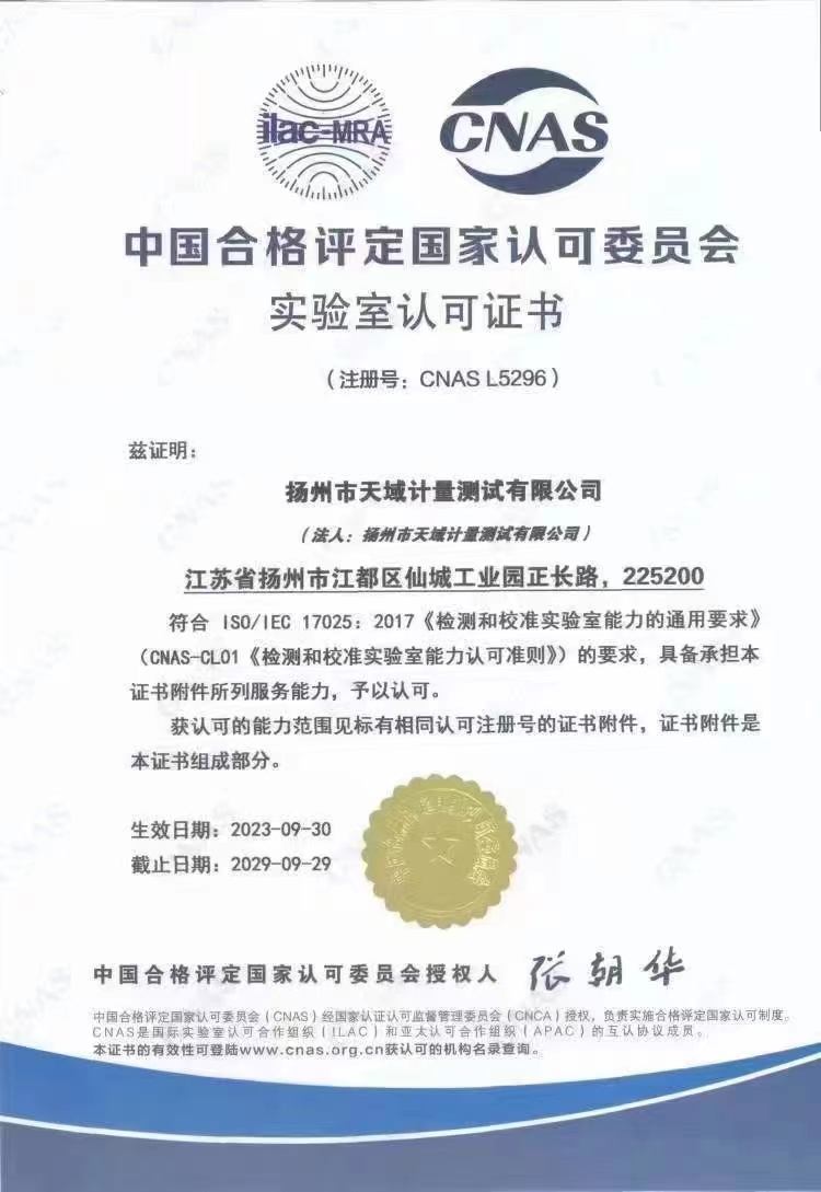 揚州市天域計量測試有限公司,坐落在交通便利的揚州市江都區(qū)仙城工業(yè)園,成立于2010年10月,2011年11月正式獲取中國合格評定國家認(rèn)可委員會認(rèn)可(授權(quán)),注冊號:CNAS L5296。近幾年的發(fā)展,實驗室已具備了較大規(guī)模,并形成了集計量器具檢測,計量技術(shù)咨詢和計量器具銷售為一體的專業(yè)化技術(shù)機構(gòu),客戶覆蓋蘇南、蘇北、和浙江,安徽部分地區(qū),客戶群總量達到了上千家企事業(yè)單位。實驗室建立健全了一套較為完整的內(nèi)外部質(zhì)量管理體系,至今未發(fā)生糾紛和客戶投訴事件。